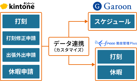 打刻情報、休暇・出張申請などの窓口をkintoneに集約し、各種情報はGaroonおよび勤怠管理システム(freee勤怠管理Plus)にカスタマイズによって自動連携を行っている。Garoonとの連携においては、kintoneとGaroon間での情報の紐づけや、スケジュールの種類ごとのカテゴライズを実施し、予定登録の効率化と登録漏れの防止を実現した。